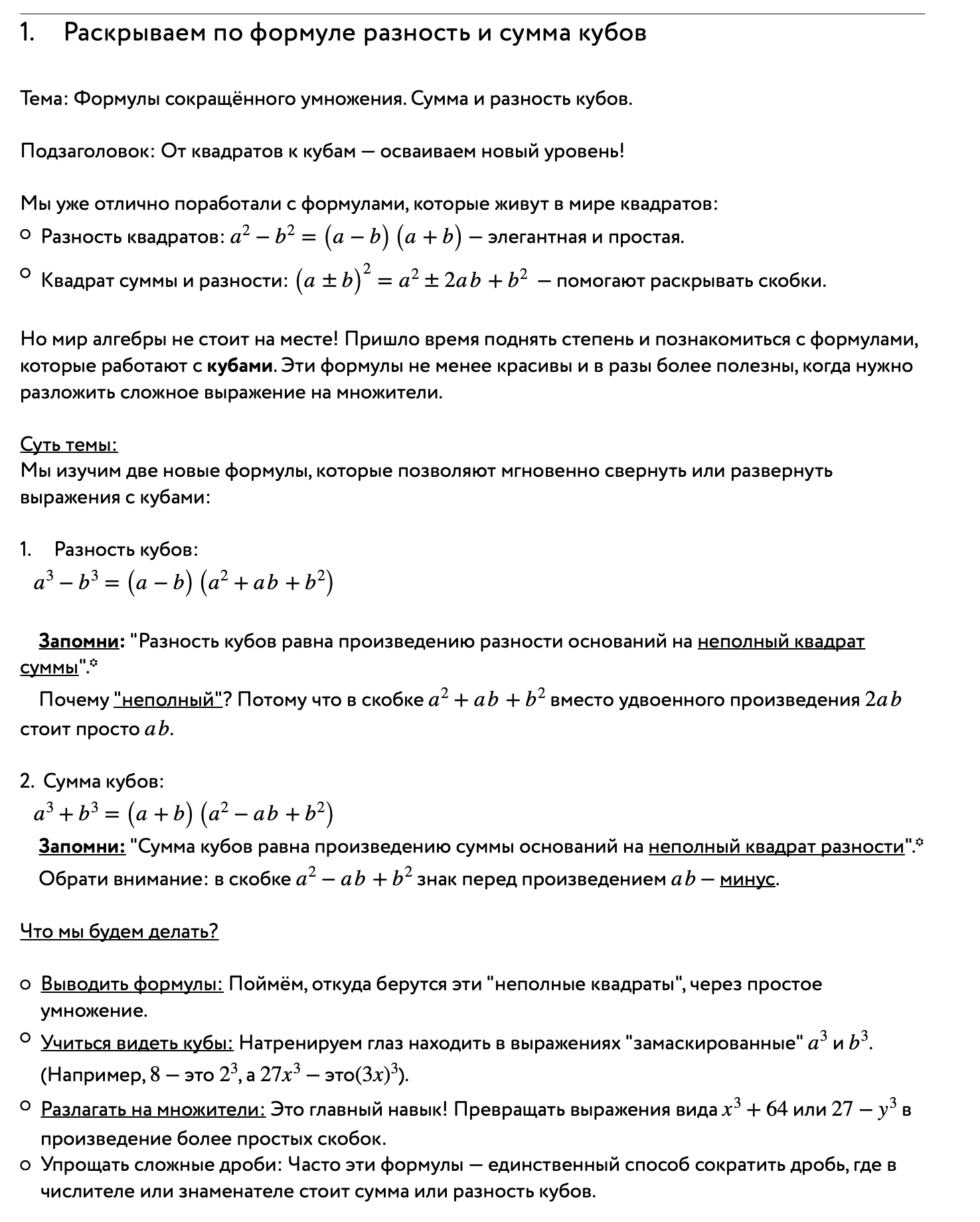 Ключевые слова для запоминания: разность кубов, сумма кубов, неполный квадрат суммы, неполный квадрат разности, разложение на множители, упрощение выражений.